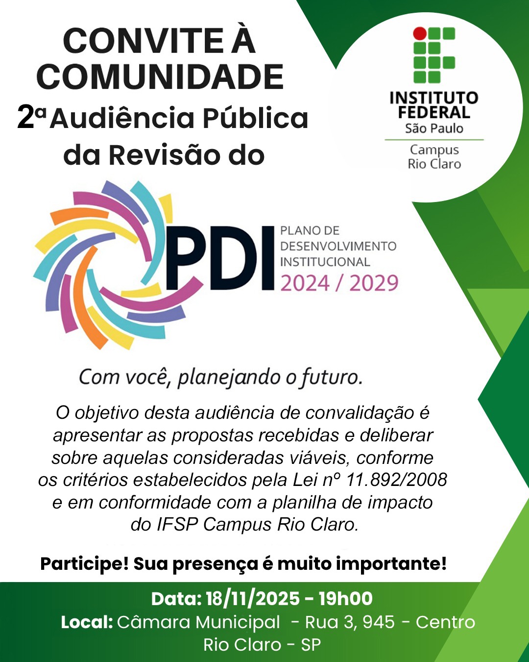 Dia 18/11, às 19h, na Câmara Municipal de Rio Claro - Convidamos toda a Comunidade de Rio Claro e região para participar da 2ª Audiência Pública de revisão do PDI 2024-2029.